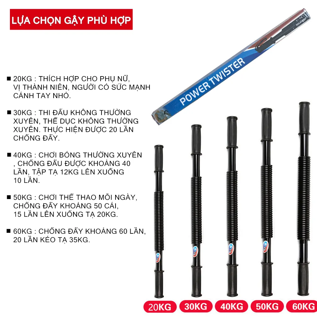 - Gậy bẻ tập cơ tay có 5 loại với mức 20kg, 30kg, 40kg, 50kg, 60kg