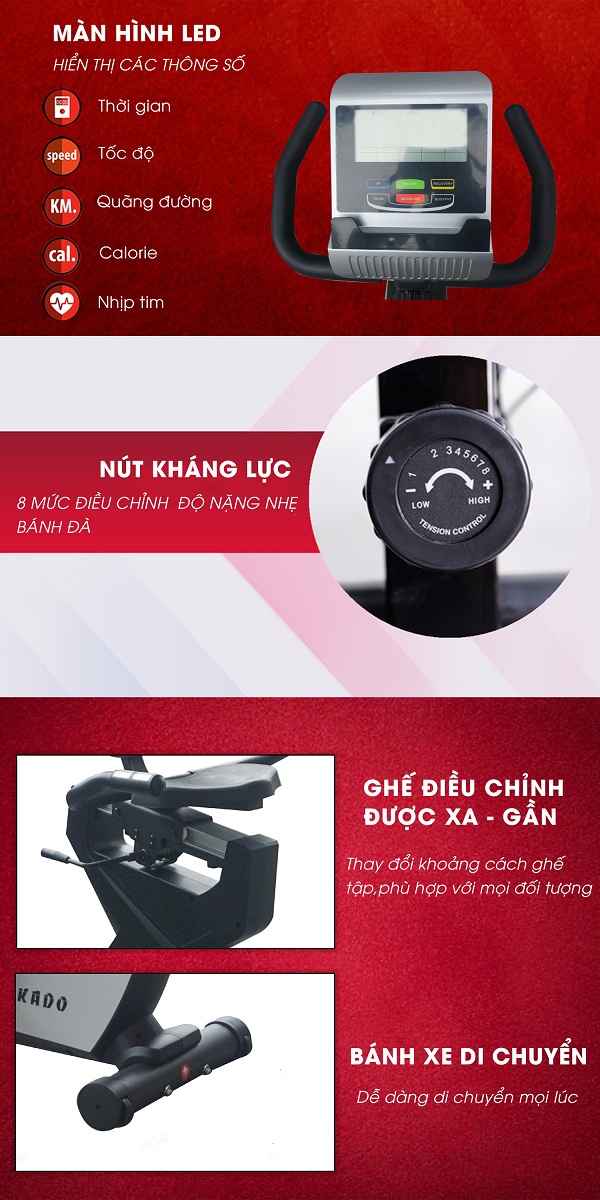 – Xe đạp thể dục sử dụng hệ thống chuyển động bánh đà kết hợp dây curoa nên ít phải bảo dưỡng, vận hành êm ái. Hơn nữa, xe có 8 cấp độ kháng lực, giúp mọi đối tượng đều có thể tập luyện được.